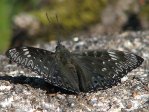 白い羽に黒いまだらがあり、触角や足までまだらな姿は、白豹のようで実に美しい。
