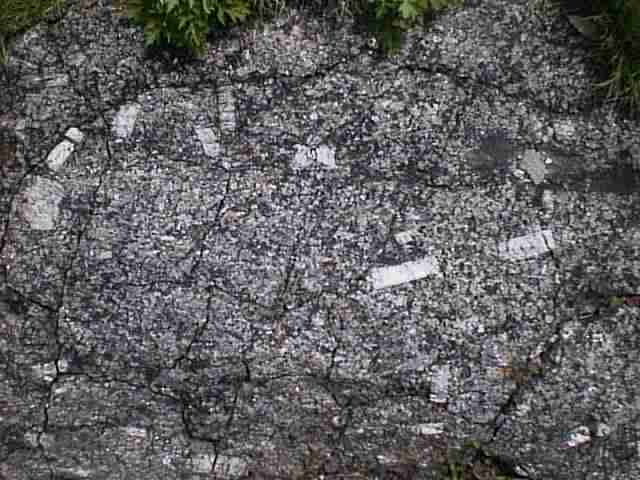 屋久島の本体を形成する岩石で、巨大な長石の結晶を含むことから屋久島花崗岩とも言われています。写真では、白い長方形の斑として写っています。